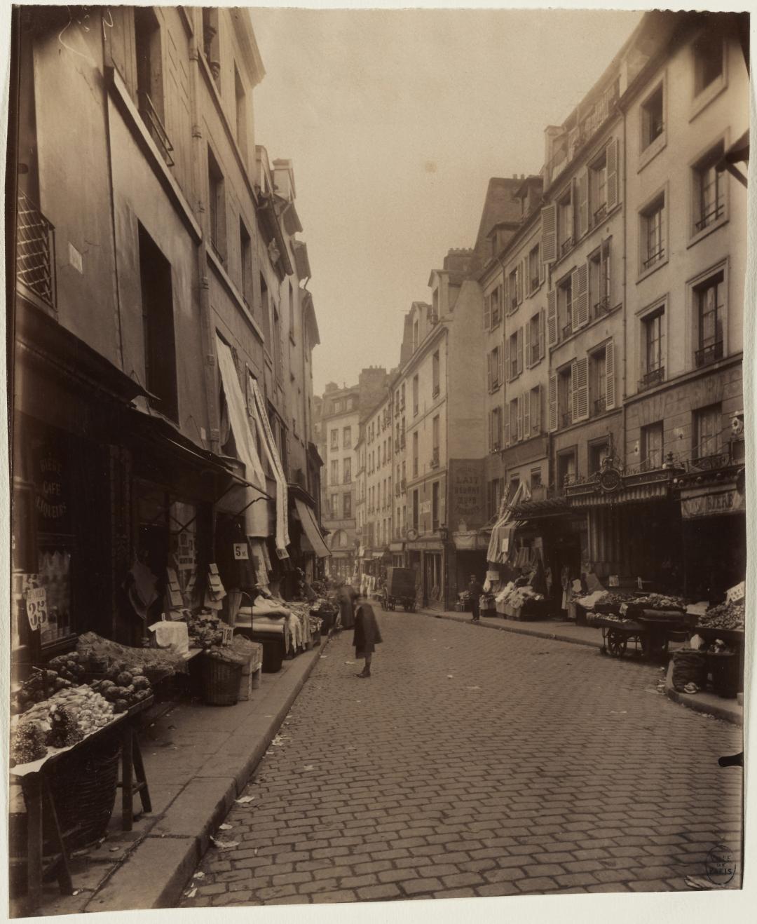 C’est précisément cette ambiance, populaire et grouillante d’activité, qu’Eugène Atget a capturée dans une série de clichés effectués dans la rue Mouffetard et ses abords aux alentours de 1905-1910 et dont le musée Carnavalet conserve plusieurs tirages. L’histoire commerciale de la rue est également représentée dans les collections du musée par plusieurs enseignes.